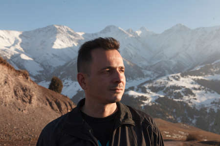 portrait of a brutal young man, dark-haired 36 years old in a sports jacket, against the background of the snow-white mountains of Tien Shan
