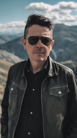 Portrait of a man in a leather jacket and sunglasses on a background of mountains