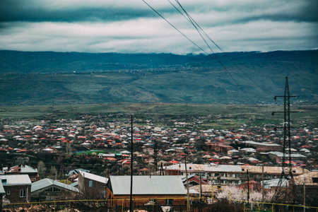 High angle shot of Ashtarak town, Armenia in spring with mountains and moody dark clouds