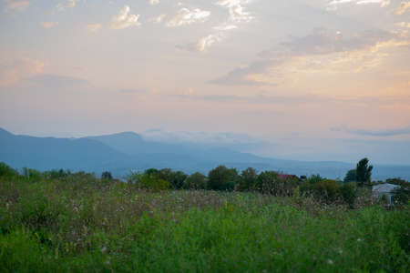 Beautiful view of the mountains with big clouds in blue sky. Krasnodar area, Sochi