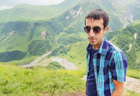 Young tourist man with a backpack against the background of the Caucasus Mountains, Georgia on a foggy day. copy space
