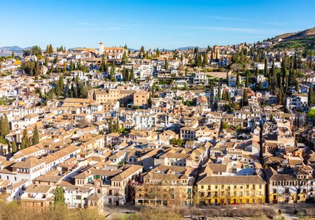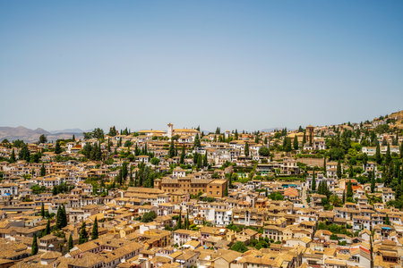 Granada town in Spain from the Alhambra complex. Panoramic view of a city nestled on a hillside under a vibrant blue sky. Panoramic view of a historic town nestled against rolling