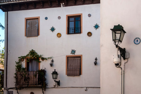 Granada, Spain, April 06, 2018: : Facade of a traditional house with decorative ceramic plates and pots of colorful flowers in the historic Albaicin neighbourhood.