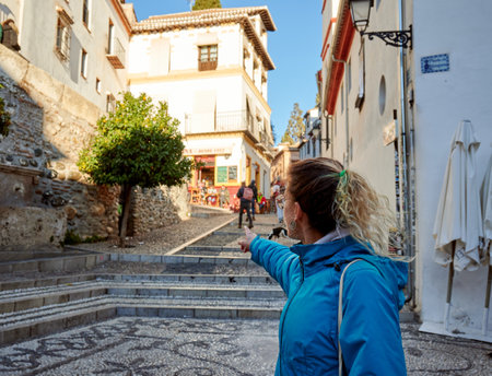 A young Caucasian girl in a blue coat pointing to a street in Granada, Spain