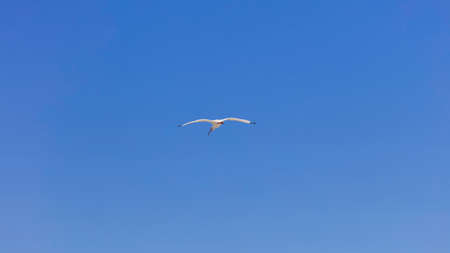 single seagull is flying in front of blue sky in Spain