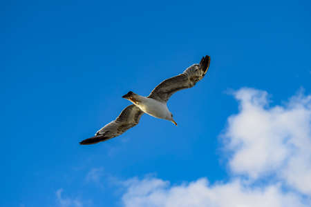 A large seagull, spreading its wings wide, soars in the sky against the backdrop of a white cloud. Summer sunny weather.