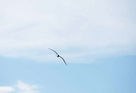 Seagull flying in the blue sky with white clouds background.