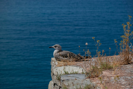 A seagull peacefully perched on a coastal cliff, enjoying the serene beauty of the ocean and the surroundings