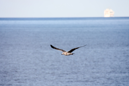 One big free white flying seagull on blue sea