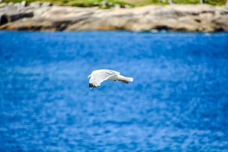 White seagull flies on a sunny day over the blue sea.
