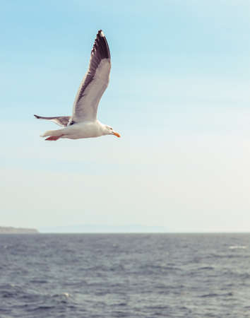Seagull flying in the sky over the sea. Beautiful seascape.
