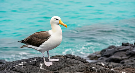 Black-browed Albatross (Thalassarche melanophrys) sitting on a rock by the sea