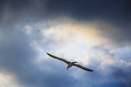 Flying sea bird as symbol of freedom behind cloudy sky