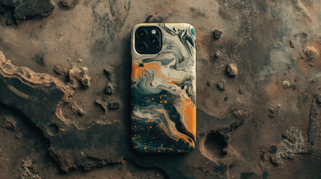 Top view of smartphone with colorful abstract paint case on rusty metal background. Mock up