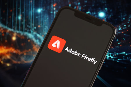 KYIV, UKRAINE - MARCH 17, 2024 Adobe Firefly logo on iPhone display screen with background of artificial intelligence futuristic ai generated image close up