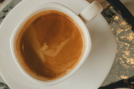 Close up of hot cup of coffee in the cafe. Concept of aroma and relax.