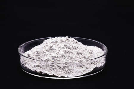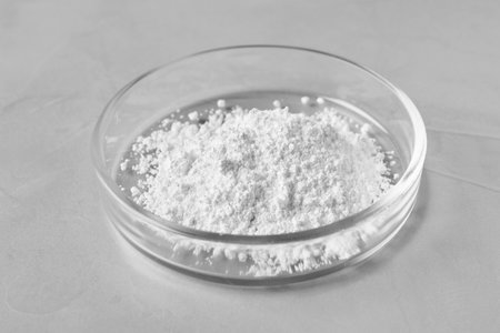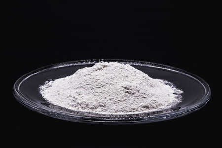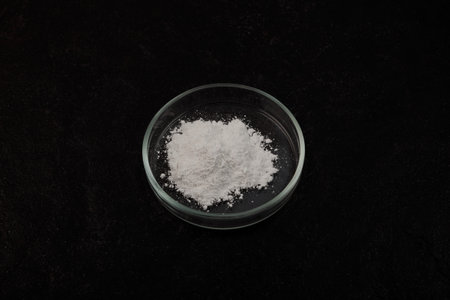 Petri dish with white chemical powder on dark background. Pile of Titanium dioxide. Food additive E171. In paint, food, toothpastes, cosmetic and skin care products, used as pigment and thickener.