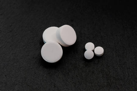 Three large white tablets and three small ones on a black background. white round pills top view. Medicare and nutritional supplements.