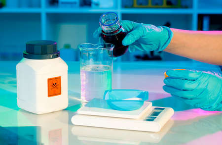 chemist wearing gloves at laboratory. testing process with glass plate and sample. viruses and health care concept