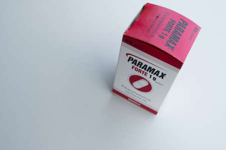 Rio, Brazil - January 27, 2023, doctor hand with protective rubber glove holding medicine box, dipyrone monohydrate
