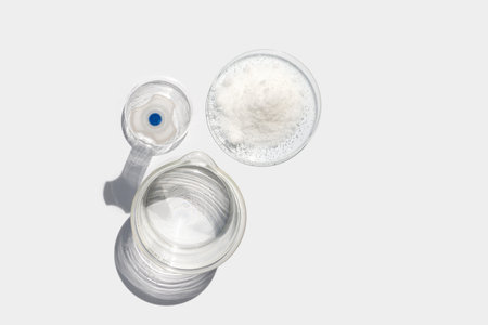 Closeup chemical ingredient on white laboratory table. Di-Ammonium Phosphate in chemical watch glass place next to beaker with alcohol and Volumetric flask. Top View