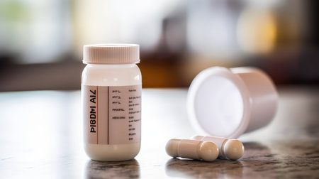 Selective focus on pink-white capsule pill fall down to white table. Antibiotic drug use with reasonable. Antibiotic drug resistance. Pharmaceutical industry. Antimicrobial drug market. Drug overuse.