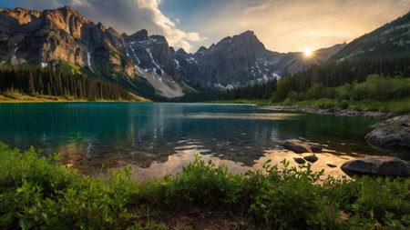 Coniferous showing mountain range reflected in a calm blue alpine lake during golden hour sunset keywords: mountain,...