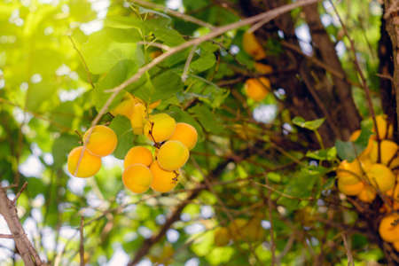 ripe apricots on a tree branch in the garden of fruit harvest