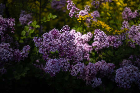 beautiful purple lilac among the green leaves on the bush in the spring garden
