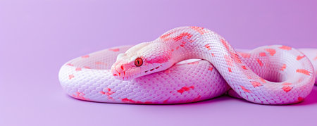 White and pink snake coiled on purple background, close-up. Exotic pet and vibrant color concept