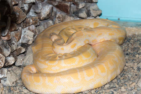Burmese python albino (lat.- Python bivittatus) in an enclosure at the Haifa Zoo
