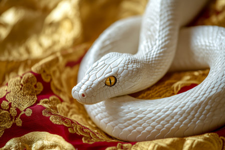 A white snake relaxes gracefully on colorful textile decor.