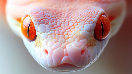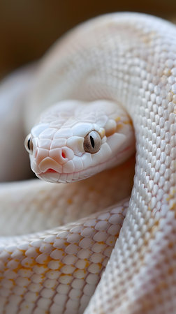 Albino Snake Coiled Up Close with Iridescent Scales against a Dreamy Light Gold Background