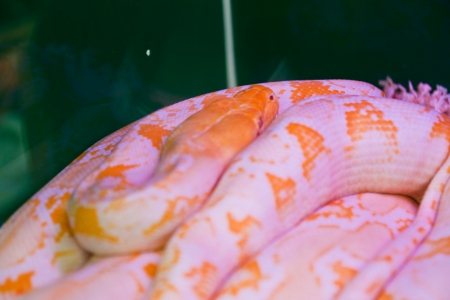 Animals: albino Indian python in a bright warm light, closeup shot