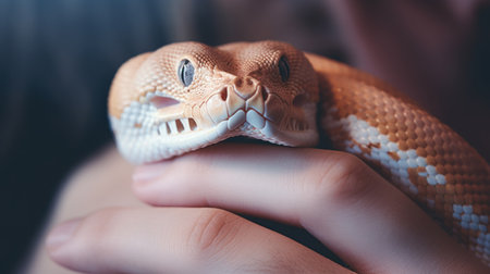 A person holding a snake with its mouth open, AI