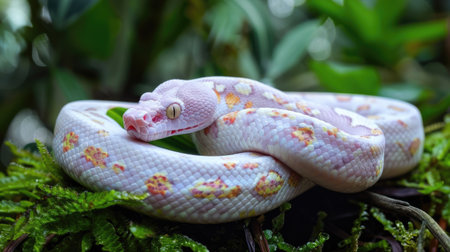 Albino snake coiled in forest, alert, nature