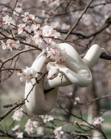 Beautiful white snake with blue eyes on a cherry blossom branch in the park. Ball python on a sakura tree. White python in the Spring Garden. Outdoor exotic pet portrait. Horizontal photo