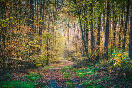 Autumn forest in the rays of the setting sun. Beautiful nature background