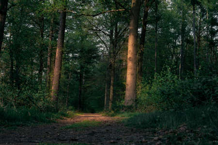 Path in the forest with tall trees and sunlight. Beautiful landscape.