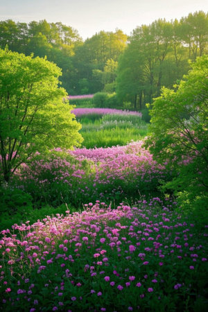 Picturesque view of the green trees in a park, backlight. Romantic scenery, meadow and forest in the spring.