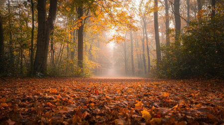 A serene autumn woodland scene with a misty pathway covered in golden leaves and warm sunlight filtering through tall trees, perfect for nature lovers.