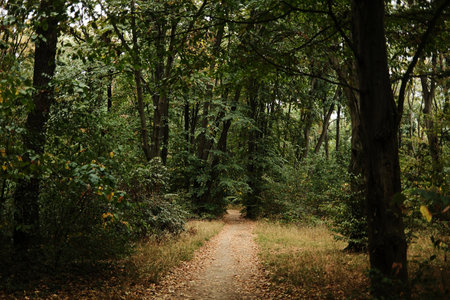 Narrow forest path surrounded by dense green trees. Peaceful woodland trail with autumn leaves on the ground, natural outdoor landscape. Zvezdarska Suma - forest in Belgrade, Serbia
