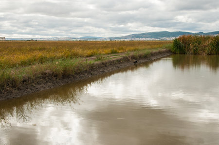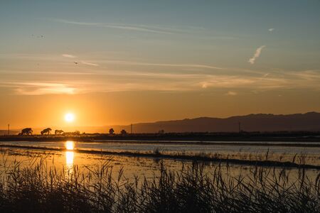 Flooded fields and ditches in the natural park of Albufera, Valencia, Spain. The sunrise sun in which the wild herbs growing in the surroundings of the wetlands paint a golden color