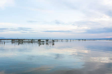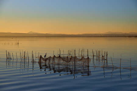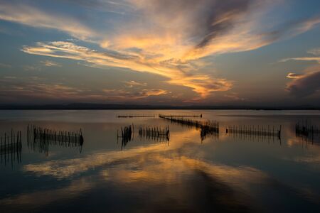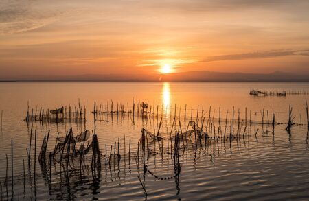 Sunset pier Albufera Valencia reflections orange sky in the lake Naural Park Spain. traditional fishing nets in the water