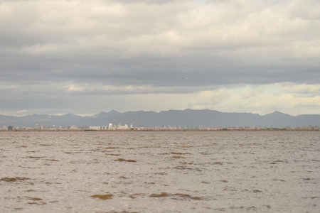 The Valencia skyline rises in the distance, viewed across the choppy, brown waters of the Albufera lagoon