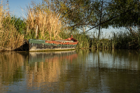Valencia, Spain - June 2, 2019: Tourists sailing on a touristic tour in a traditional boat on the Albufera lake in Valencia on a sunny day