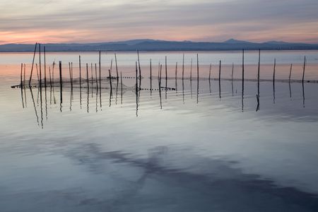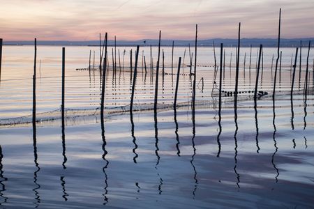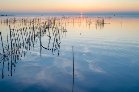 typical fishing system with rods and sticks, of the Valencia lagoon in Spain. sunset sky