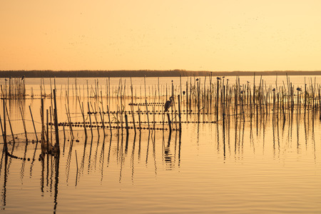 Birds sitting on traditional fishing poles in the calm waters of Albufera natural park, Valencia, Spain
