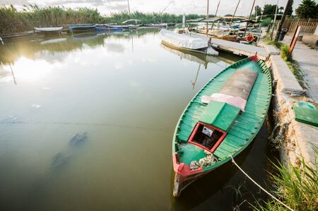 several traditional wooden boats on the mooring dock. harbor of the Albufera nature reserve, Catarroja Valencia Spain