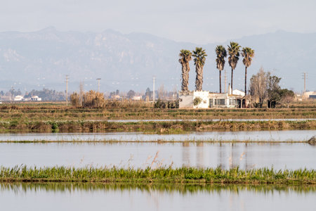 Delta Ebro, Natural park, Tarragona, Catalonia, Spain, Jan 2020: Rice fields after harvest still flooded with traditional farmhouse landscape, Delta river Ebro, Tarragona, Spain